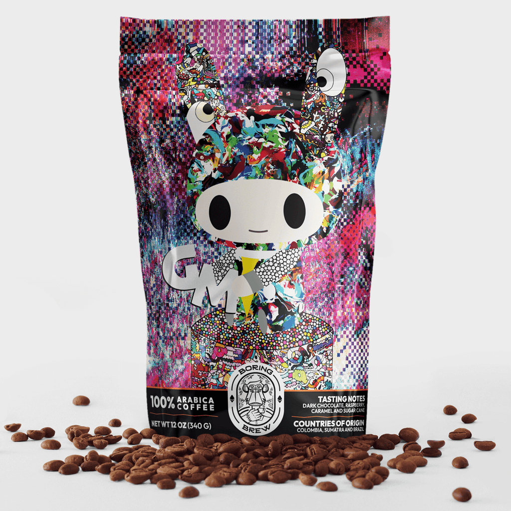 Enjoy Boring Brew's exclusive Dark Roast Coffee, with flavor notes of Dark Chocolate, Raspberry, Caramel, and Sugar Cane. A blend from Colombia, Sumatra, and Brazil, packed in a limited-edition metallic coffee bag. Inspired by The 6529 Meme CC0 GMgm, our coffee guarantees fair trade and supports non-profits with each sale.