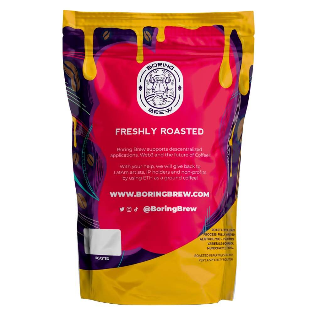 Enjoy Boring Brew's exclusive Dark Roast Coffee, with flavor notes of Dark Chocolate, Raspberry, Caramel, and Sugar Cane. A blend from Colombia, Sumatra, and Brazil, packed in a limited-edition metallic coffee bag featuring Koda #5212 by Bee House Buzz, our coffee guarantees fair trade and supports non-profits with each sale.